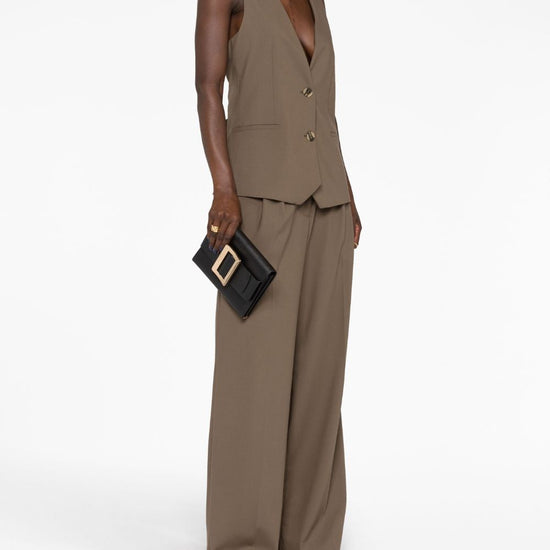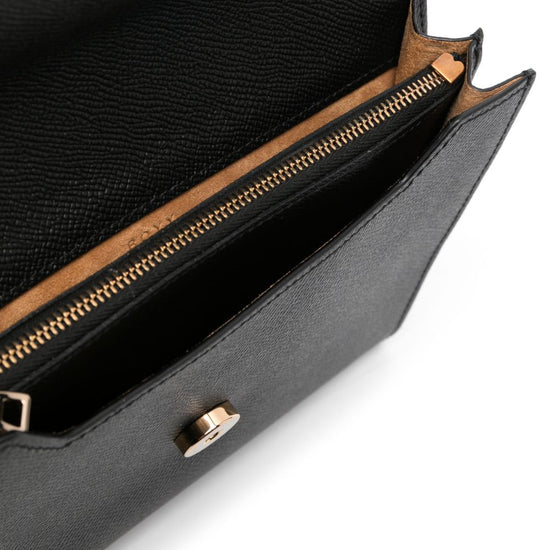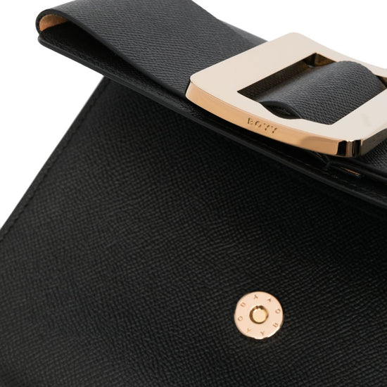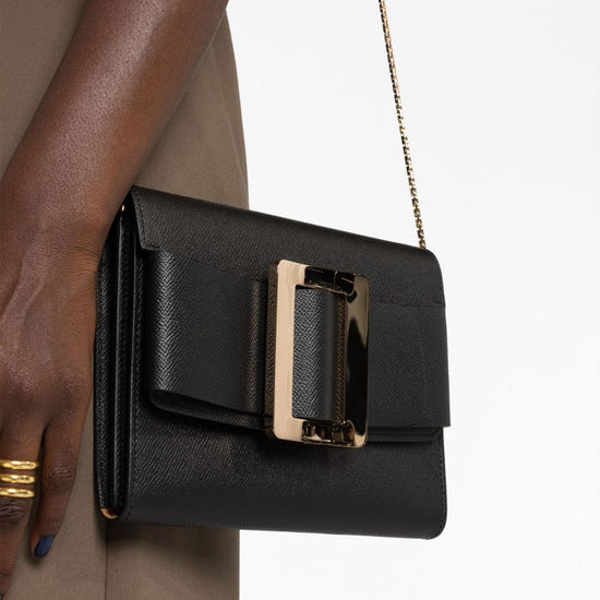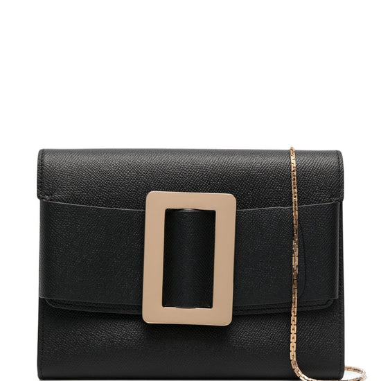 Buckle-detail leather clutch from boyy featuring black, leather, grained texture, gold-tone hardware, decorative buckle detail, detachable chain-link shoulder strap, foldover top with magnetic fastening, partitioned compartment and zip-fastening compartment. small, silver buckle buckle travel case epsom leather handbag size and fit - width 8,27 in / 21 cm