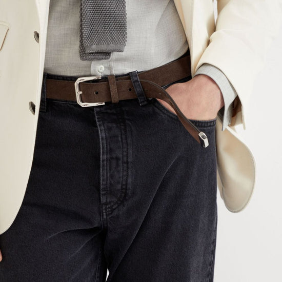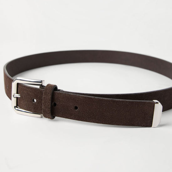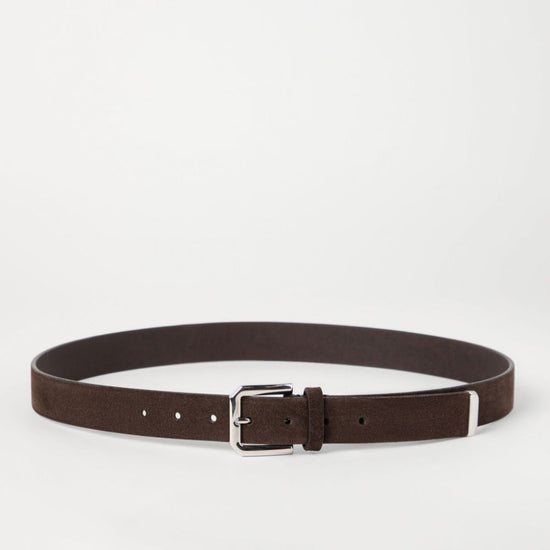 Chocolate brown calf leather buckle fastening silver-tone hardware punched holes adjustable fit leather belt