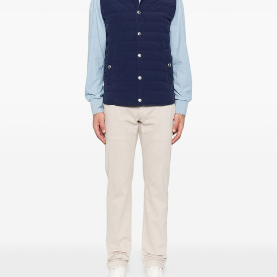 Navy blue quilted design snap-fit fastening sleeveless high neck welt pockets nylon down vest