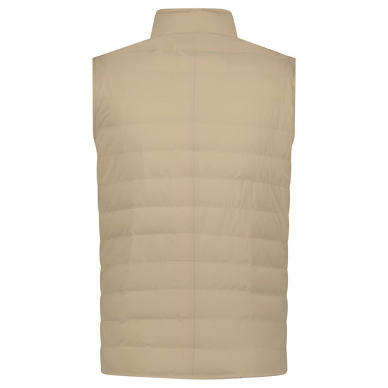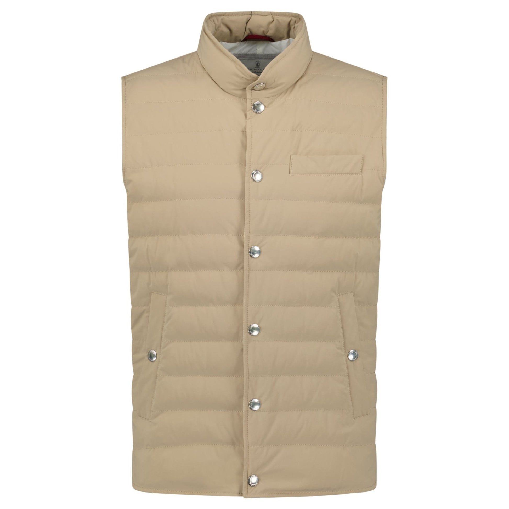 elevate your layering game with the brunello cucinelli button-up down gilet in beige. this refined piece combines classic tailoring with lightweight comfort, making it a perfect transitional essential. the down-filled construction offers warmth without bulk, while the tonal press-stud buttons and high collar give it a smart, streamlined silhouette. style it over knitwear or under a coat for added insulation and understated luxury.
