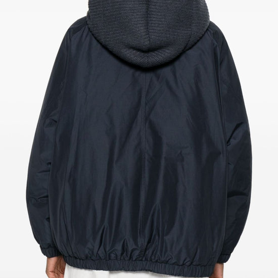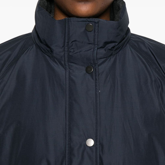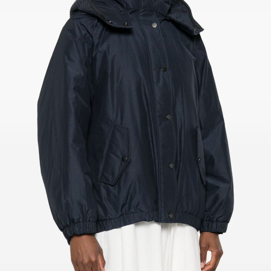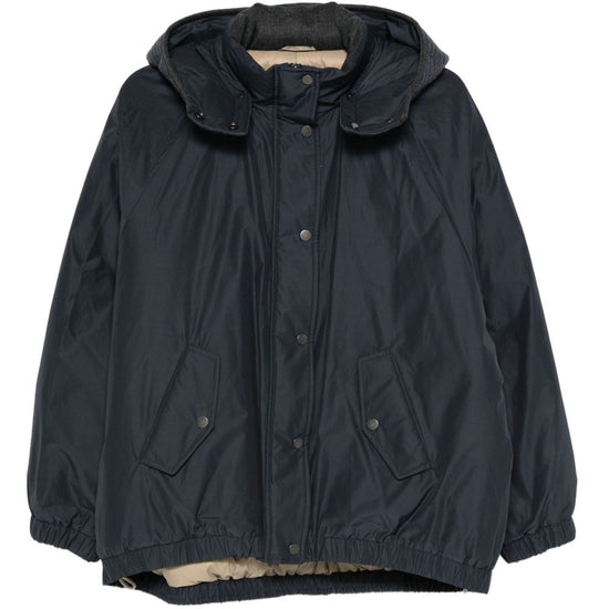 Dark blue detachable hood press-stud fastening dropped shoulders long sleeves hooded down jacket