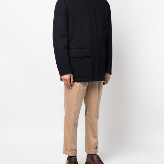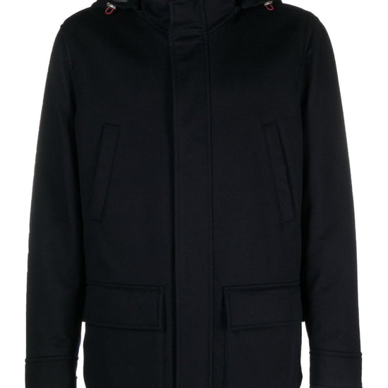 Midnight blue cashmere/silk-cotton blend stand-up collar detachable drawstring hood concealed front fastening long sleeves belted cuffs two side slit pockets two side flap pockets straight hem cashmere parka coat