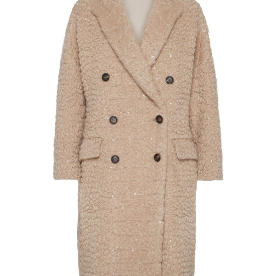 Camel boucle texture sequin embellishment double-breasted fastening notched lapel welt pockets wool double-breasted coat
