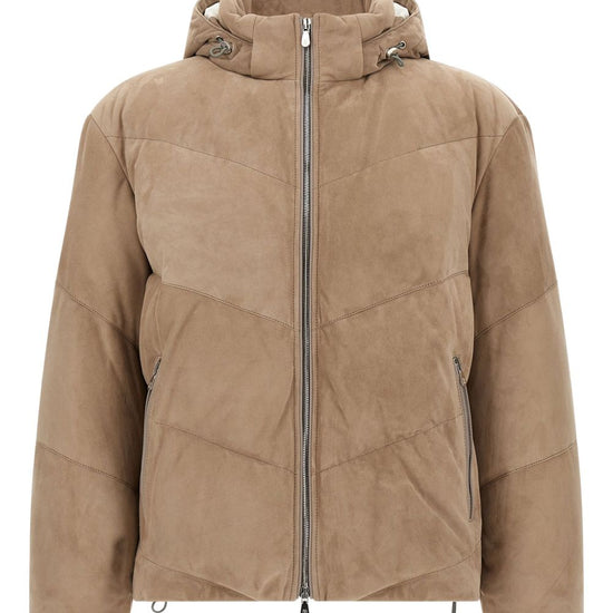 Beige quilted design suede leather front zip closure hood adjustable drawstring hem leather short down jacket