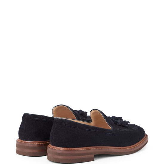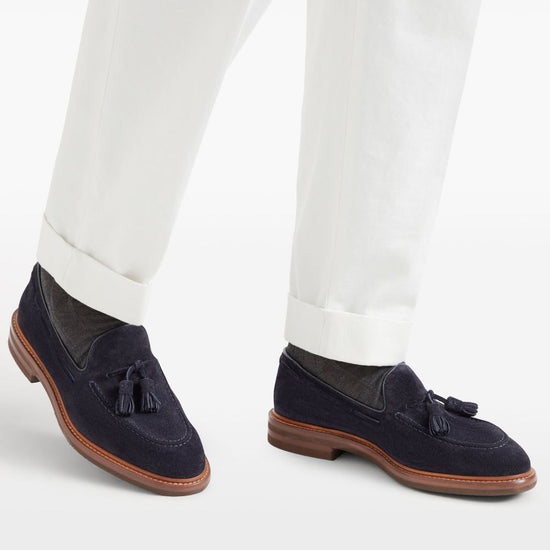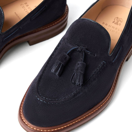 Indigo blue calf suede tassel detail apron toe almond toe slip-on style branded leather insole stacked heel leather sole suede leather loafers