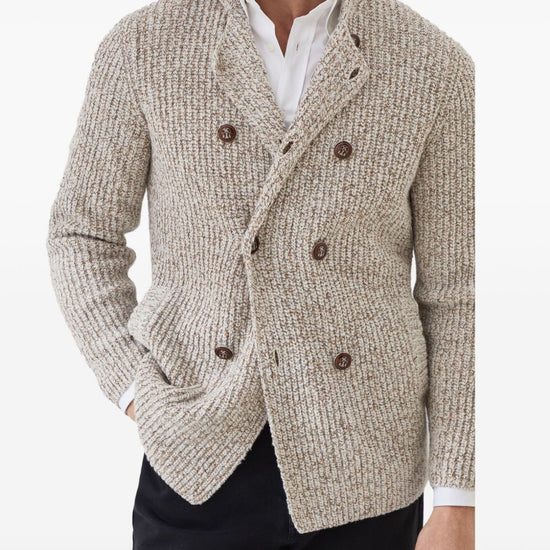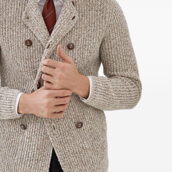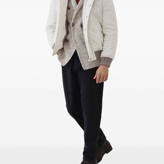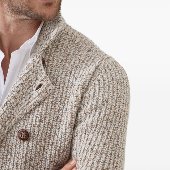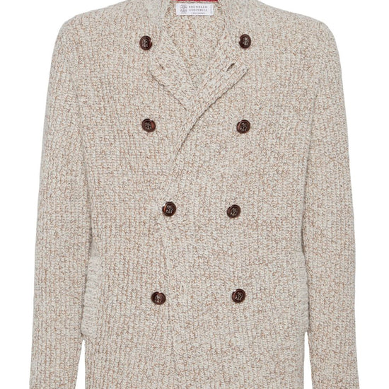 Brunello Cucinelli Mouliné virgin wool, silk and cashmere half English rib one-and-a-half breasted cardigan with metal buttons