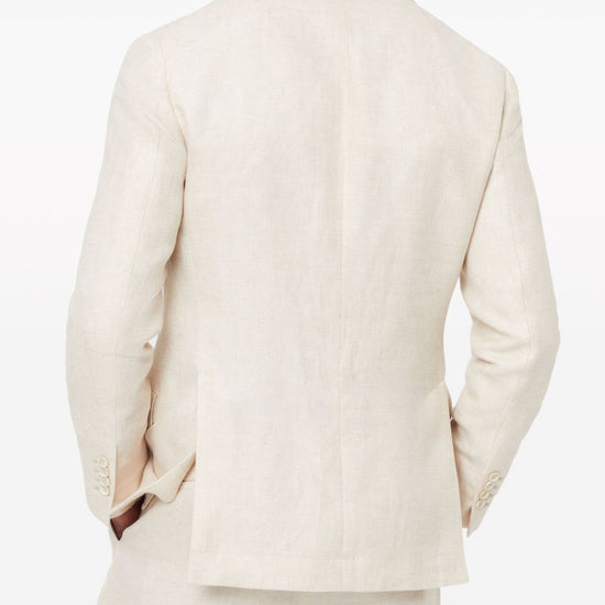 Light beige linen-silk blend twill weave dart detailing notched lapels front button fastening long sleeves chest welt pocket three side flap pockets english rear vents partial lining linen jacket