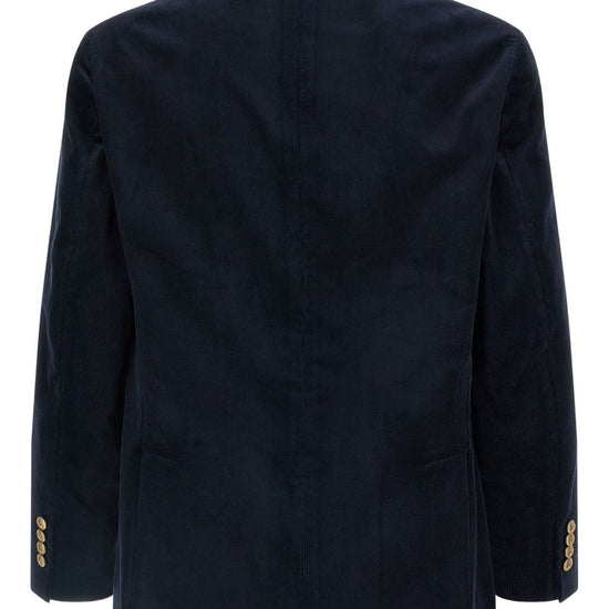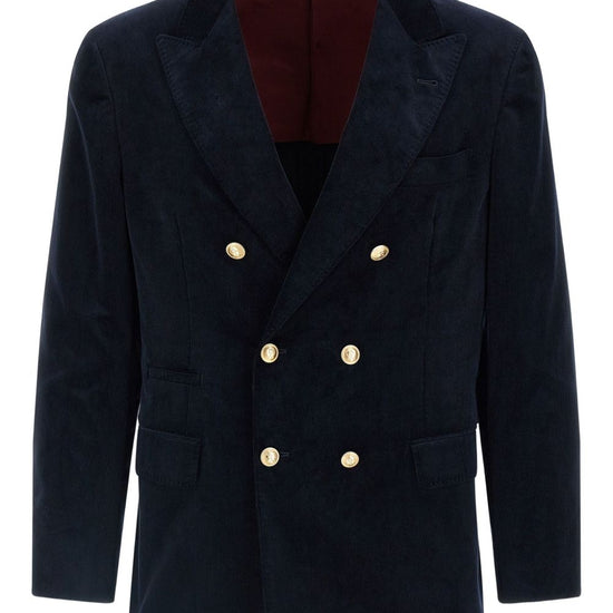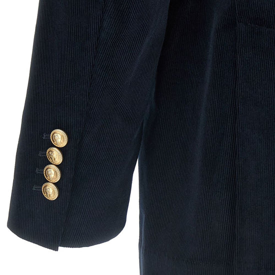 Blue corduroy metal buttons peak lapels flap pockets cotton double-breasted jacket
