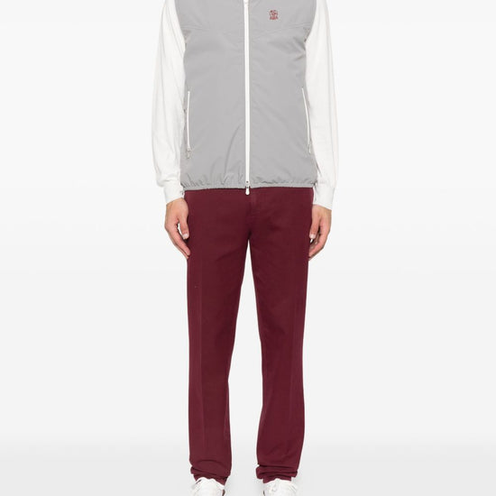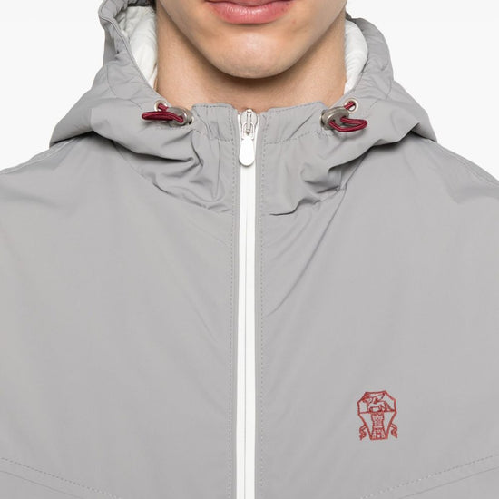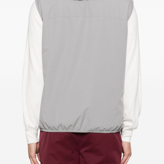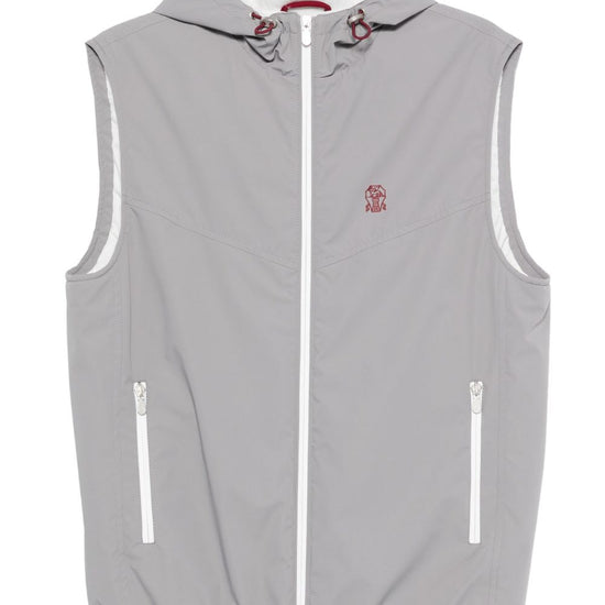 Grey hooded neckline zip front fastening sleeveless design side zip pockets elasticated hem nylon vest