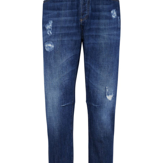 Indigo-blue cotton distressed finish whiskering effect at the thighs embroidered logo to the front logo patch to the rear belt loops mid-rise front button and zip fastening straight leg classic five pockets denim jeans with tears