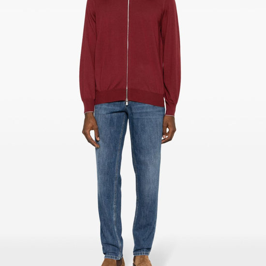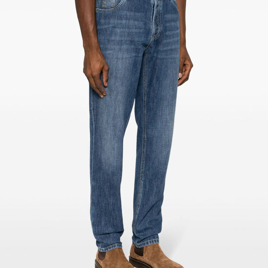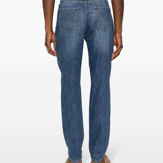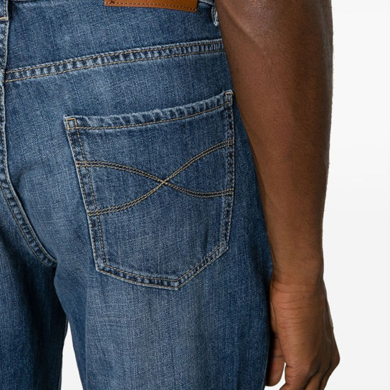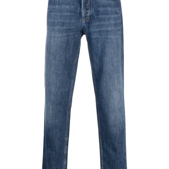 Blue cotton logo patch to the rear washed denim mid-rise belt loops button fly fastening classic five pockets slim cut turn-up hem denim cotton jeans