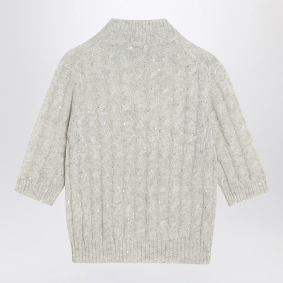 Round-neck sweater by brunello cucinelli in a light grey blend of mohair, cotton, and wool, characterized by short sleeves, ribbed edges, cable knit design with micro sequins, and a high collar. size and fit - model wears size s model measurements: height: 178 cm chest: 83 cm waist: 63 cm hips: 91 cm