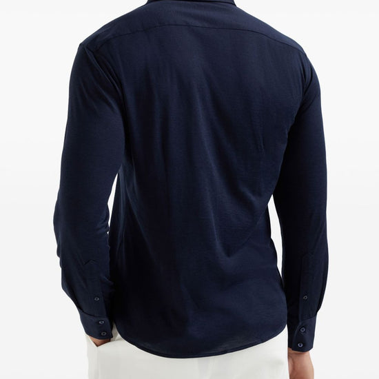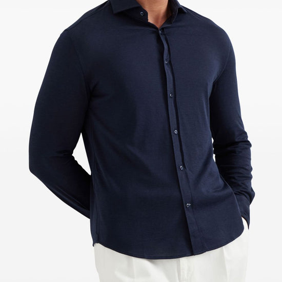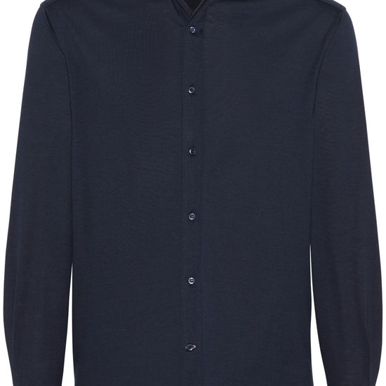 Blue long sleeves front button fastening buttoned cuffs straight hem silk and cotton blend shirt