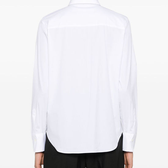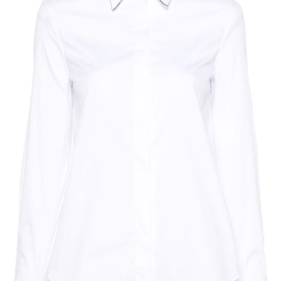 White cotton blend poplin texture pointed flat collar signature monili chain detail long sleeves buttoned cuffs curved hem concealed front button fastening cotton shirt size and fit - this piece fits true to size. we recommend you get your regular size. model is 1,75m / 5ft 8in wearing size s