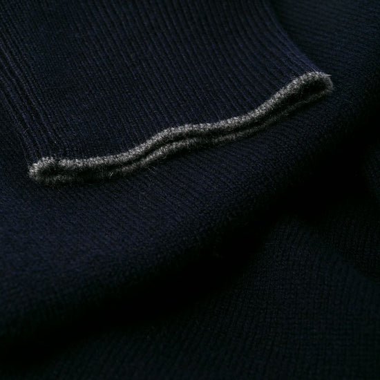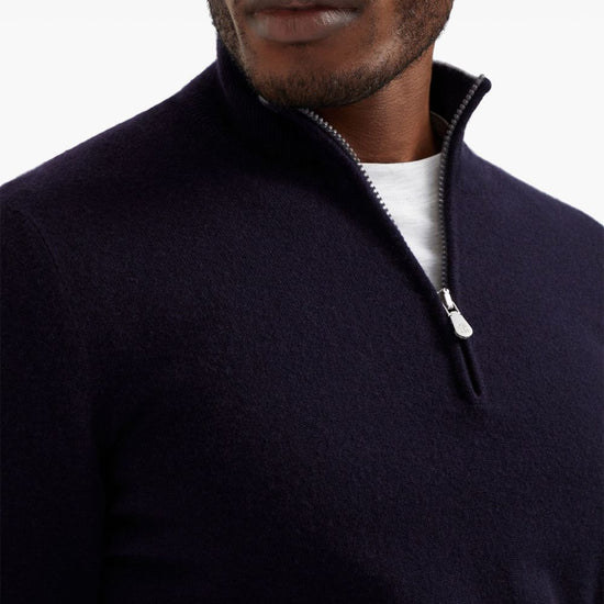 Navy blue cashmere knitted construction funnel neck short front zip fastening long sleeves ribbed cuffs and hem straight hem cashmere high-neck sweater
