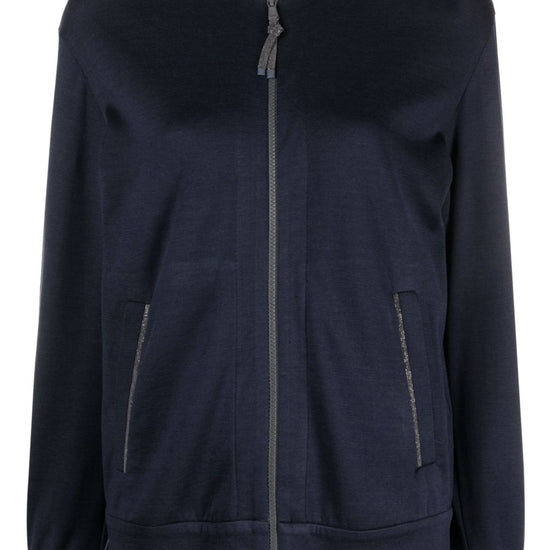 Navy blue cotton blend signature monili chain detail classic hood front two-way zip fastening long sleeves two side slash pockets cotton and silk hoodie