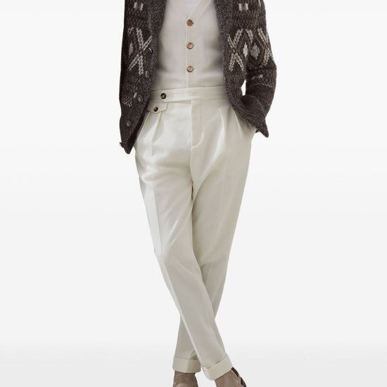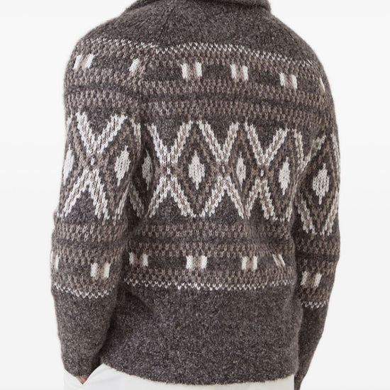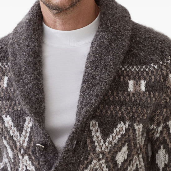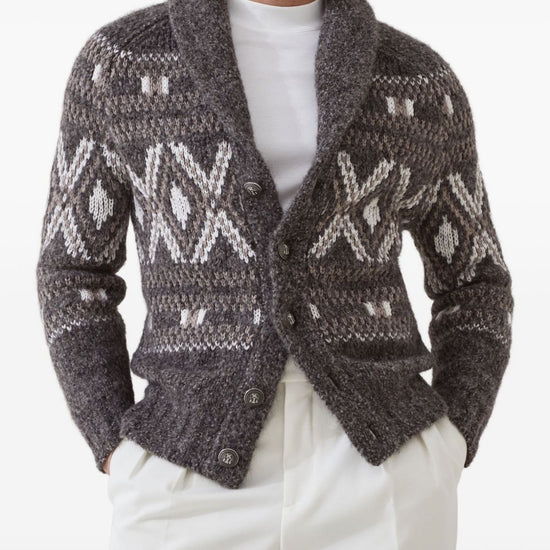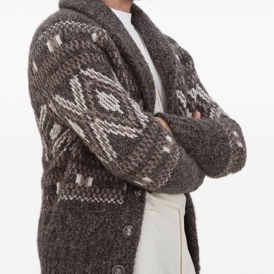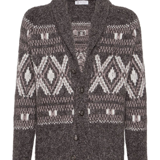 Brunello Cucinelli Alpaca, virgin wool and cashmere geometric jacquard cardigan with metal buttons