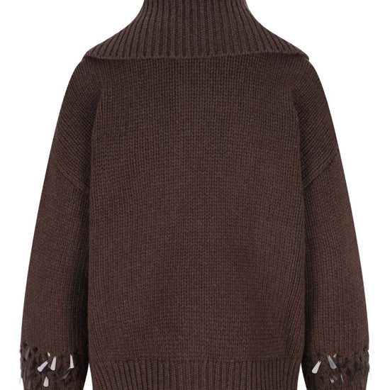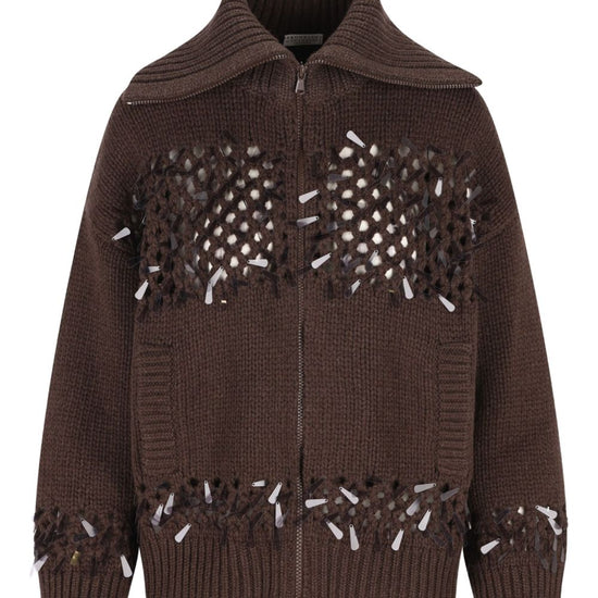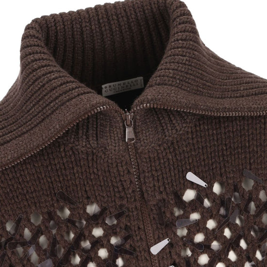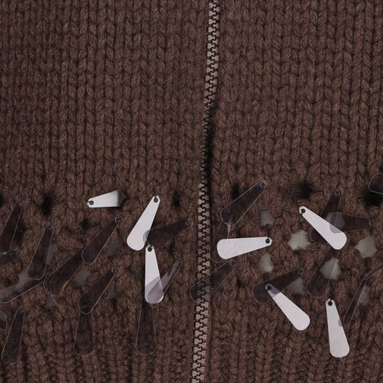Brown zip closure paillette embellishment knitted construction cashmere cardigan