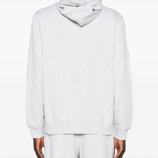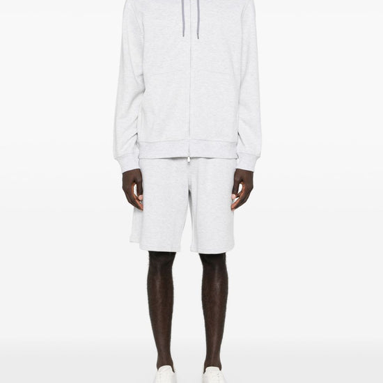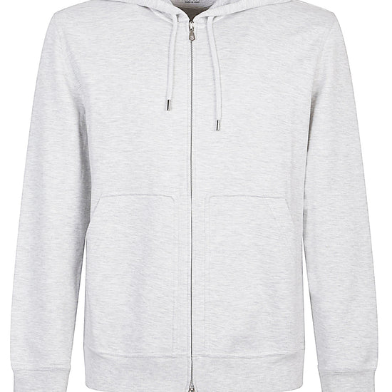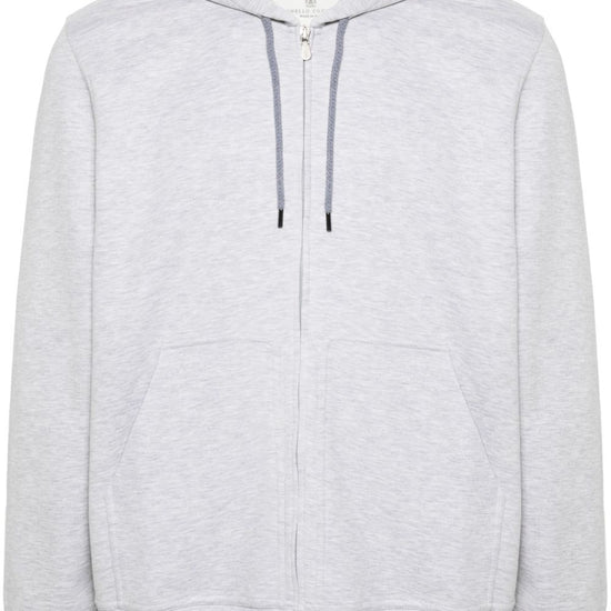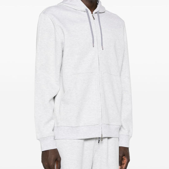 Heather grey cotton blend jersey texture mélange effect drawstring hood front two-way zip fastening long sleeves two side pouch pockets ribbed cuffs and hem cotton blend zipped hoodie