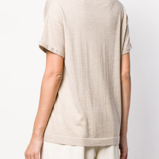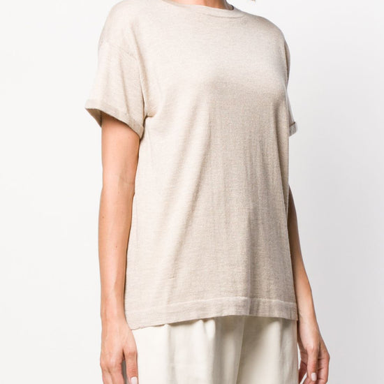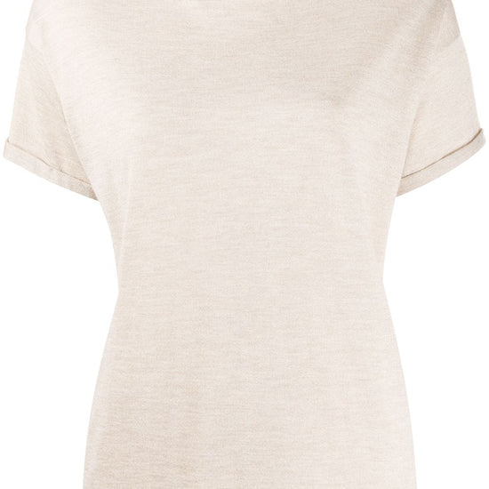 Nude cashmere blend knitted top from brunello cucinelli featuring a boat neck, short sleeves, a knitted style, a relaxed shape and a boxy fit. cashmere and silk t-shirt