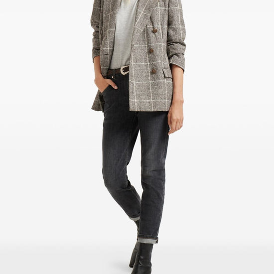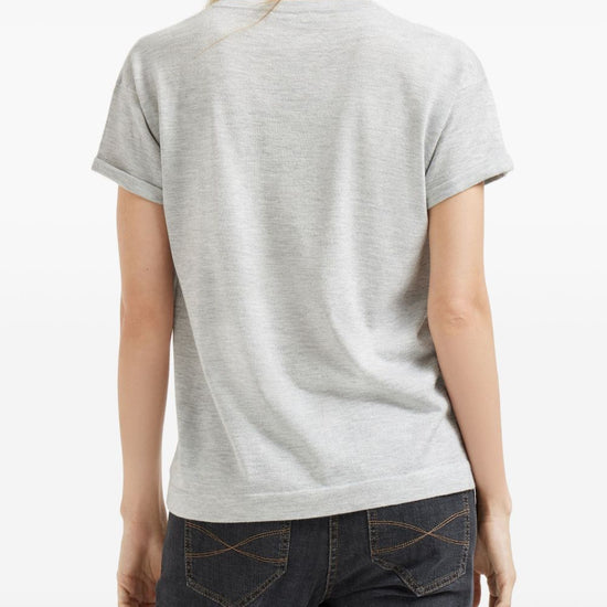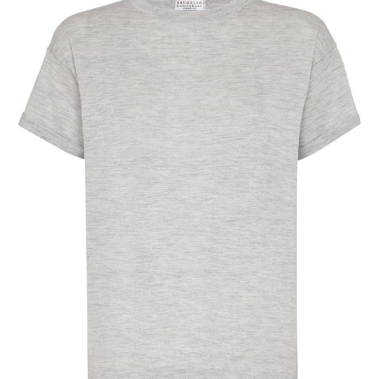 Grey cashmere-silk blend round neck short sleeves turn-up cuffs straight hem cashmere and silk t-shirt