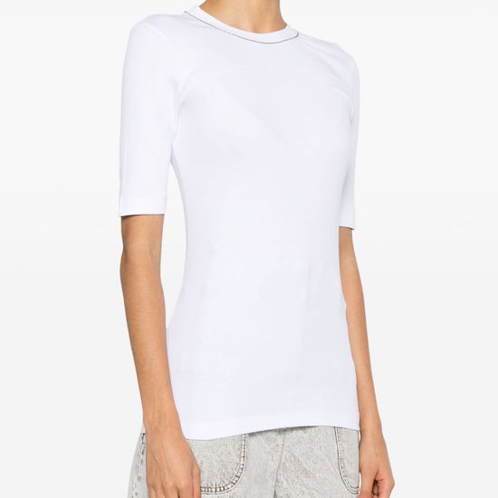 Optical white cotton blend stretch-design crew neck signature monili chain detail short sleeves straight hem rear button fastening cotton t-shirt size and fit - this piece fits true to size. we recommend you get your regular size. model is 1,75m / 5ft 8in wearing size s