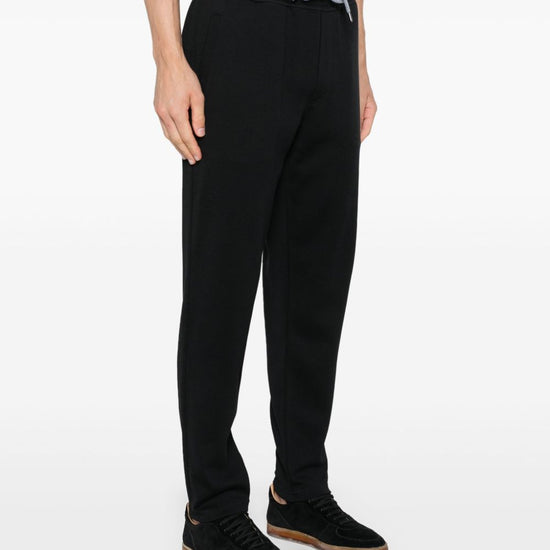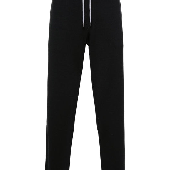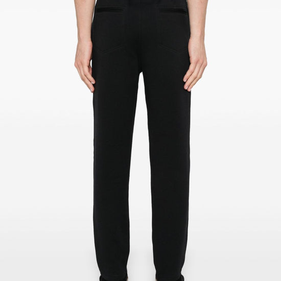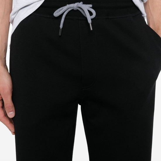 Black cotton blend jersey texture elasticated drawstring waistband two side inset pockets two front jetted pockets straight leg cotton blend sweatpants