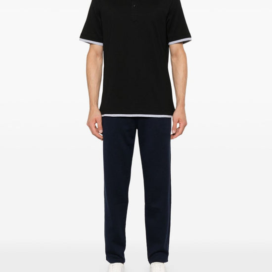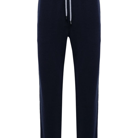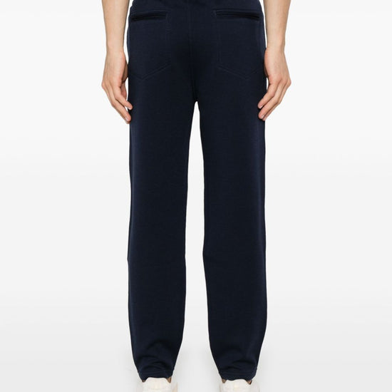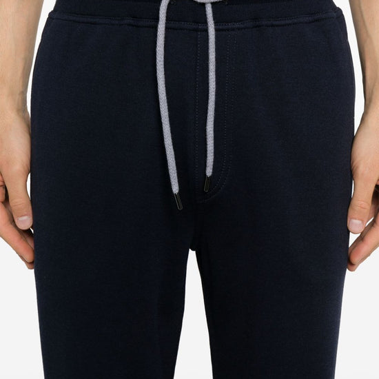 Navy blue cotton blend jersey texture elasticated waistband two side welt pockets two rear jetted pockets tapered leg drawstring fastening cotton blend sweatpants