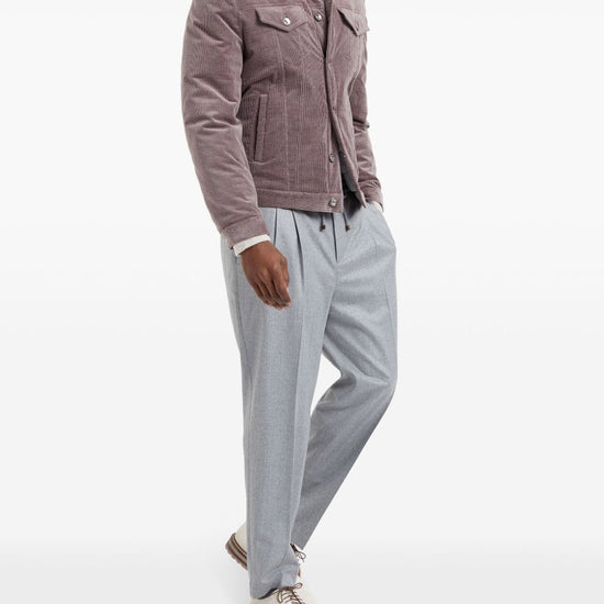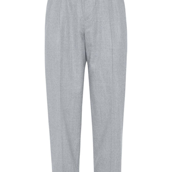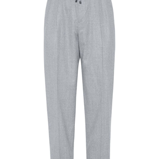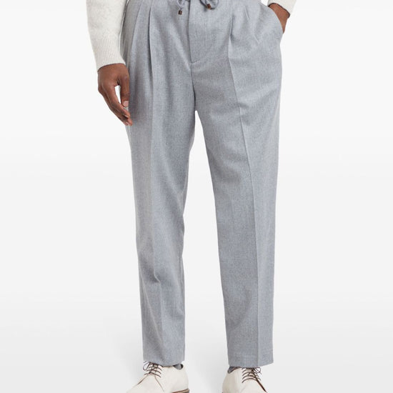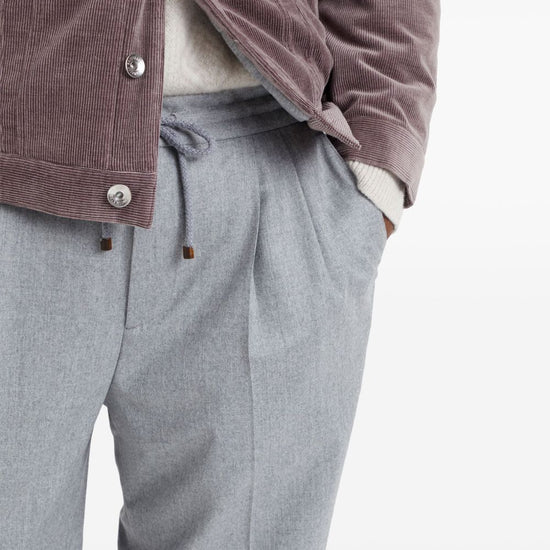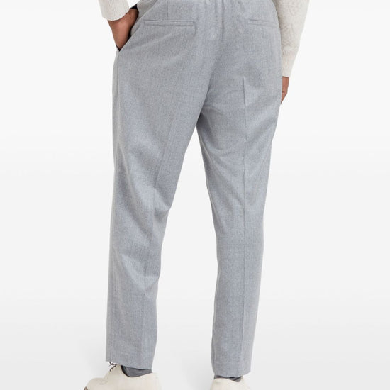 Beluga grey virgin wool pressed crease elasticated drawstring waistband two side slit pockets two rear jetted pockets tapered leg wool trousers
