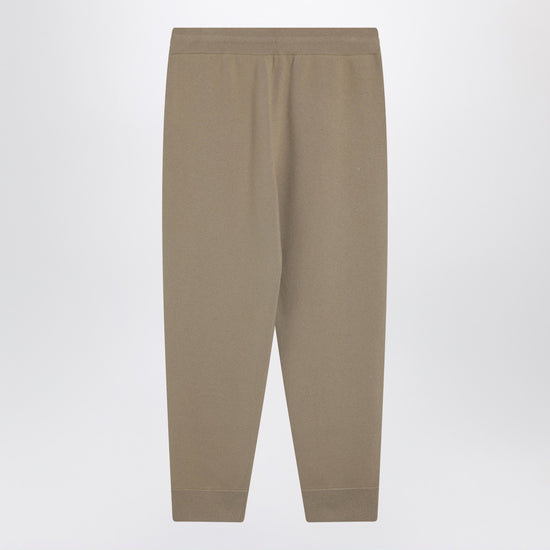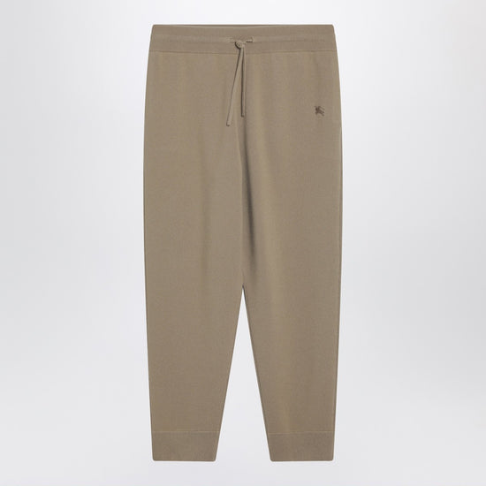 Beige cashmere-blend trousers by burberry, featuring elasticated drawstring waist, ribbed trims, two side pockets, and tone-on-tone embroidered equestrian knight design logo on the front. size and fit - model wears size l model measurements: height: 179 cm chest: 82 cm waist: 65 cm hips: 90 cm