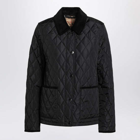 Black quilted nylon burberry jacket, featuring a snap button closure, two front patch pockets, long sleeves, and a ribbed velvet collar. size and fit - model wears size s model measurements: height: 178 cm chest: 89 cm waist: 62 cm hips: 88 cm