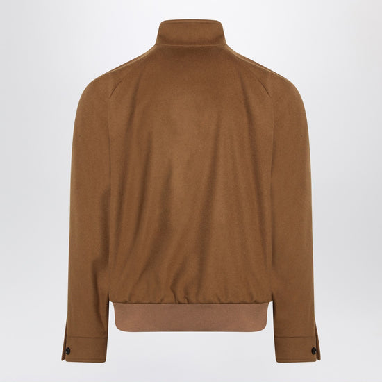 Light brown cashmere jacket by burberry featuring a double-zip front fastening, buttoned collar, two side welt pockets, ribbed hems, long sleeves with buttoned cuffs, check patterned lining, tone-on-tone embroidered equestrian knight design on the front and regular fit.