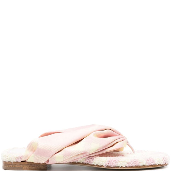Light pink/yellow square open toe satin strap check print branded insole terry-cloth effect lining signature equestrian knight motif at the sole flat leather sole check thong sandals size and fit - heel 0,8 in / 2 cm