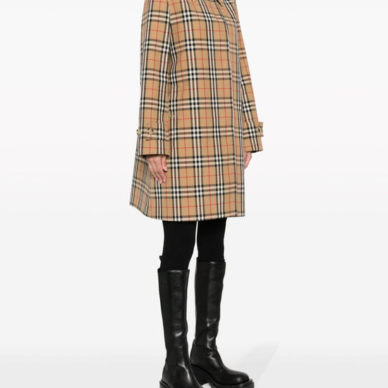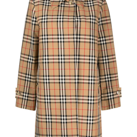 Plaid-check pattern jacket from burberry featuring brown, cotton, plaid check pattern, spread collar, concealed front fastening, long sleeves, buttoned cuffs, above-knee length and straight hem. check motif raincoat size and fit - this piece fits true to size. we recommend you get your regular size. model is 1,75m / 5ft 8in wearing size 8 (uk)
