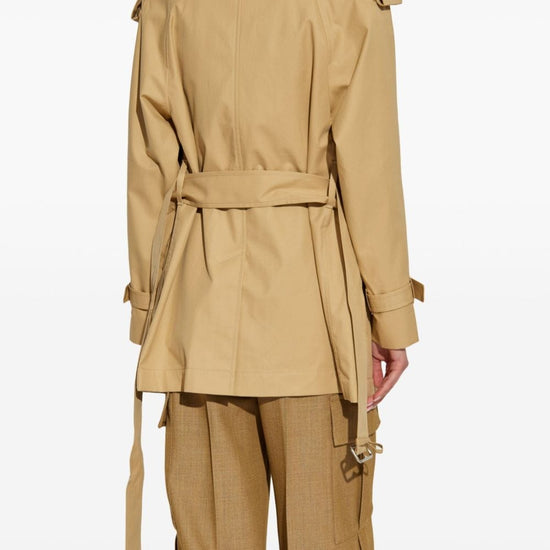 Beige cotton gabardine weave classic collar epaulettes long sleeves belted waist belted cuffs straight hem cotton trench coat size and fit - this piece fits true to size. we recommend you get your regular size. model is 1,75m / 5ft 8in wearing size 8 (uk)