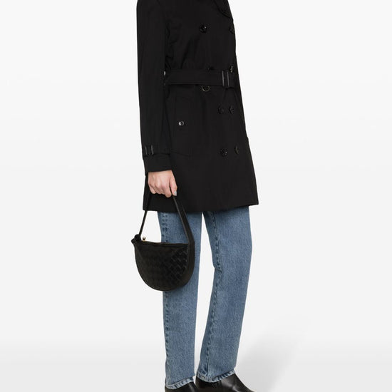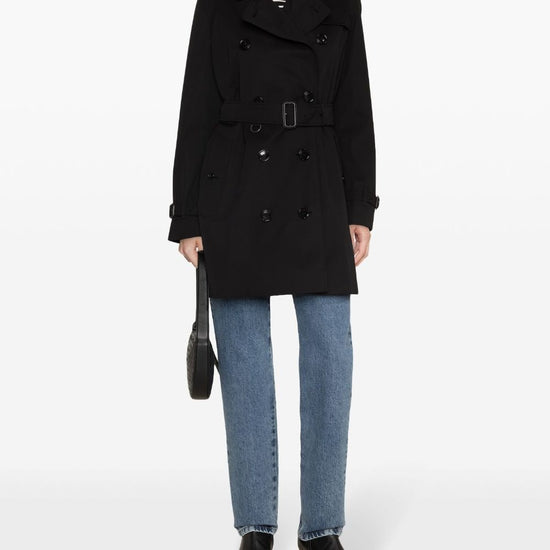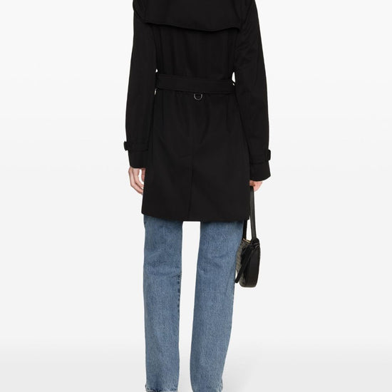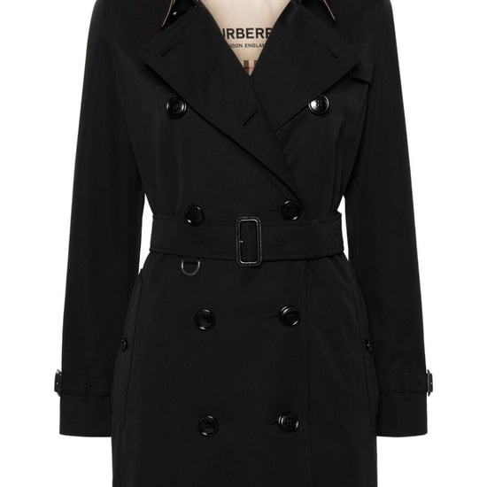 Black cotton gabardine weave ulster lapels front button fastening logo-debossed buttons epaulettes long sleeves belted cuffs storm flap to the front/rear belted waist two front button-fastening jetted pockets american rear vent straight hem vintage check-pattern lining mid-length kensington cotton trench coat size and fit - this piece fits true to size. we recommend you get your regular size. model is 1,75m / 5ft 8in wearing size 8 (uk)