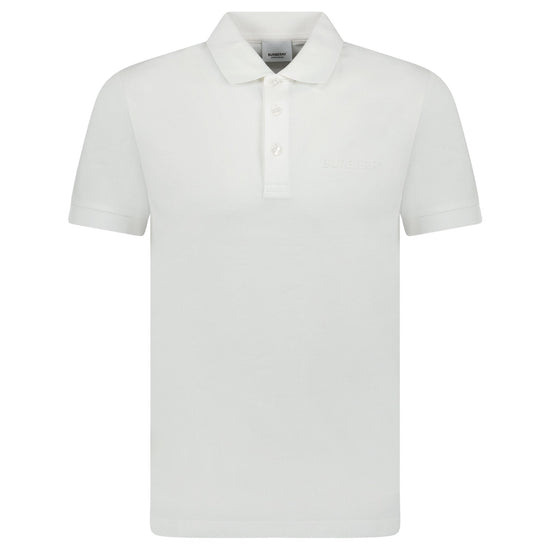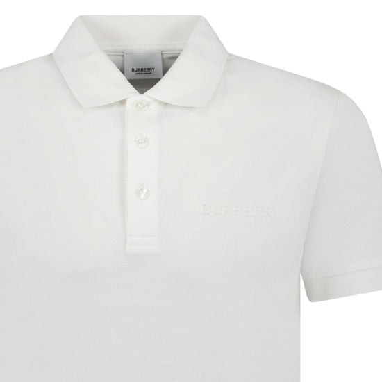 elevate your wardrobe with the burberry 'hartford' embossed logo polo in white. this timeless polo shirt combines classic style with a modern twist, featuring a sleek embossed burberry logo across the chest. crafted from premium cotton pique, it offers a soft, breathable feel, making it perfect for any occasion. the structured collar and button placket add a refined touch, while the versatile white colour ensures easy styling.