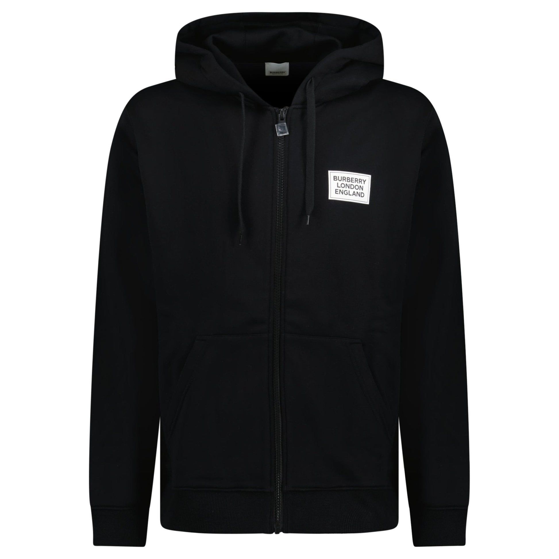 elevate your casual wardrobe with the burberry 'hove' logo hoodie zip sweatshirt in black, a refined piece that seamlessly blends comfort with burberry's timeless style. this hoodie features a drawstring toggled hood and is crafted with attention to detail, embodying the brand's iconic heritage. the sweatshirt boasts a burberry london logo plaque on the chest, adding a touch of luxury, while the zip-up fastening ensures versatile wear.