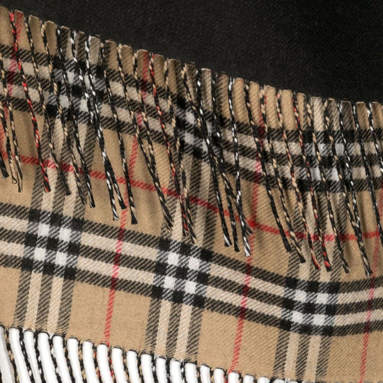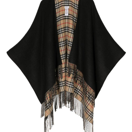 Black/multicolour wool reversible house check pattern fringe detailing open front check wool reversible cape