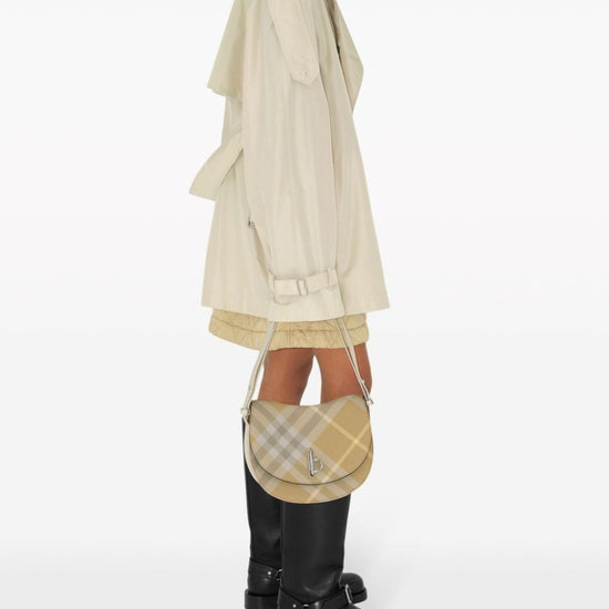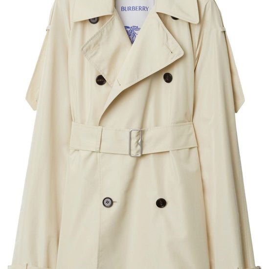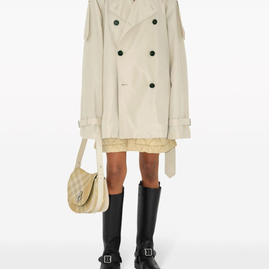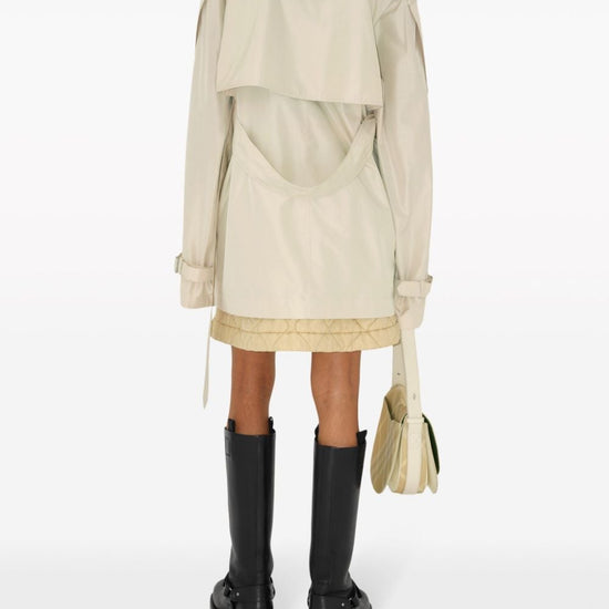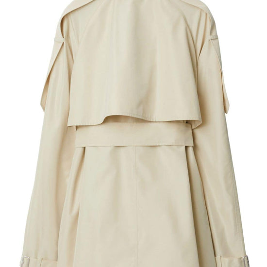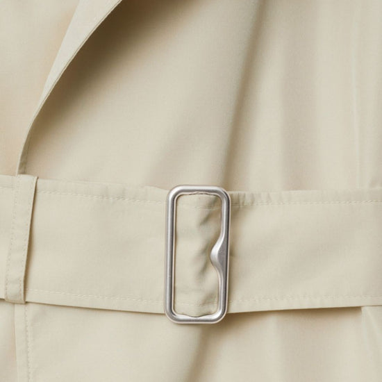 Light beige silk notched lapels double-breasted button fastening belted waist storm flap long sleeves belted cuffs straight hem silk short trench coat size and fit - this piece fits true to size. we recommend you get your regular size. model is 1,75m / 5ft 8in wearing size 8 (uk)