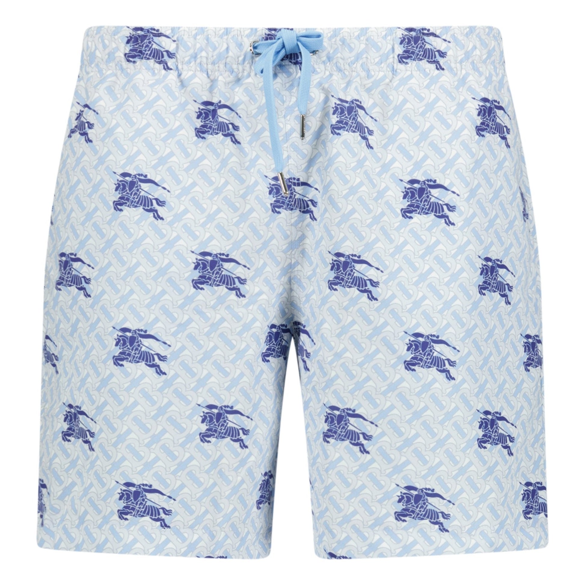 elevate your summer wardrobe with the burberry 'martin' swim shorts in blue. these stylish swim shorts feature an all-over monogram print and are crafted from lightweight, quick-drying fabric, making them perfect for beach days or lounging by the pool. the elasticated drawstring waistband ensures a comfortable fit, while the classic burberry equestrian knight motif adds a touch of heritage style. designed for versatility, these shorts are both functional and fashionable.