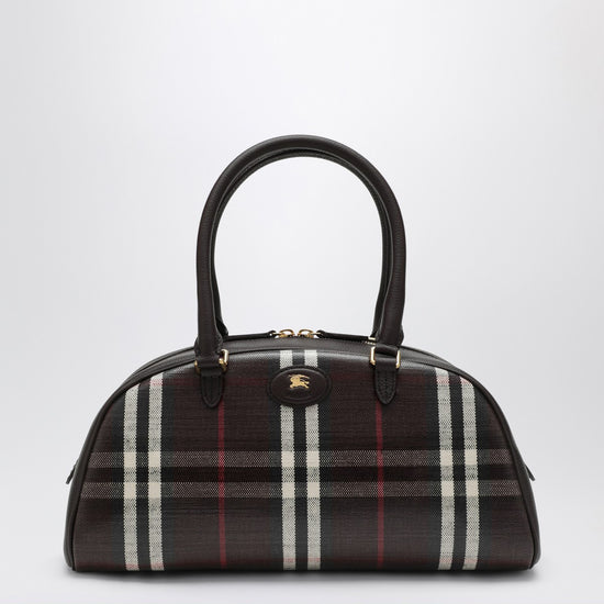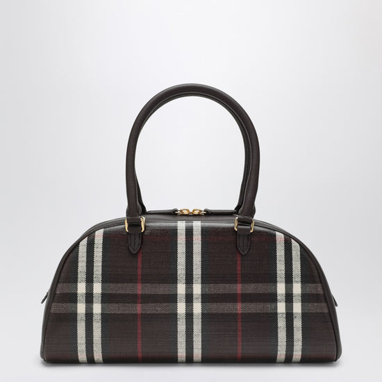 Medium hand bag by burberry in a cotton-linen blend, characterized by leather trims, check jacquard fabric with a coated finish, leather handles, adjustable and removable shoulder strap, zip closure, internal slip pocket, brushed metal elements, and a leather label with equestrian knight design on the front. size and fit - width 33 cm x height 16 cm x depth 12 cm adjustable shoulder strap length min 80 cm - max 100 cm handle drop: 16 cm