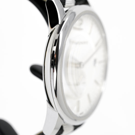 the silver dial showcases a subtle check pattern, complemented by silver-tone hands and index hour markers for a refined aesthetic. a small seconds subdial is positioned at the 6 o'clock mark, with a date display at 3 o'clock.