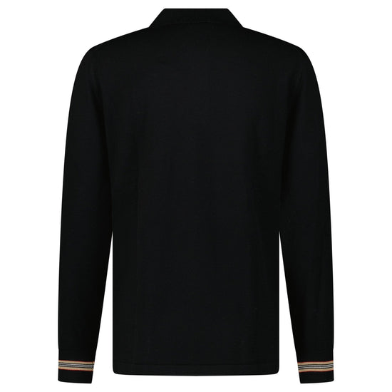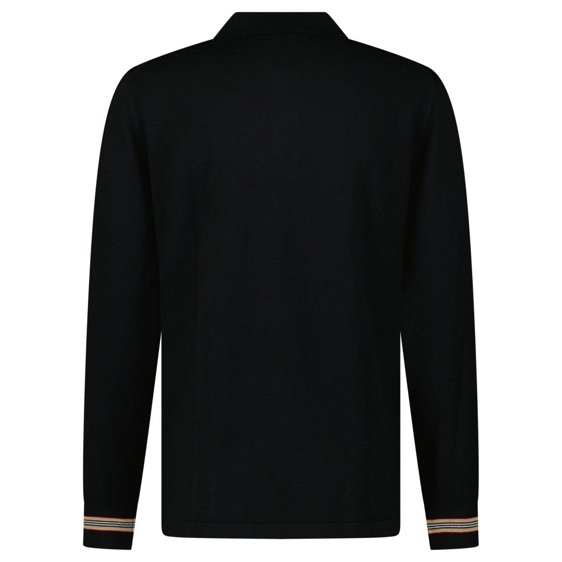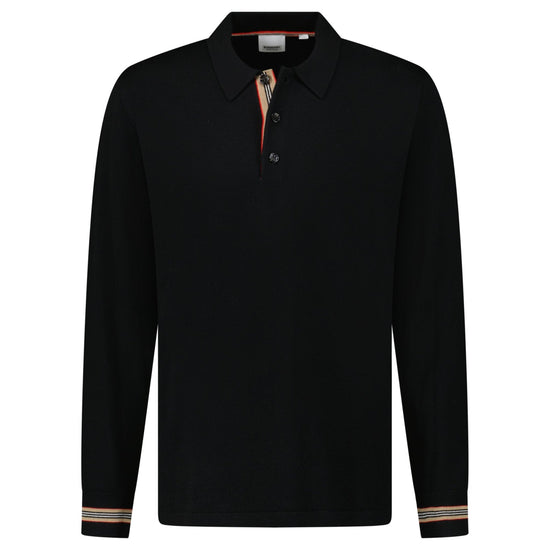 the burberry ‘pace’ signature stripe wool polo in black delivers timeless sophistication with a modern twist. expertly crafted from soft, lightweight wool, this long-sleeve polo features a classic collar and a three-button placket adorned with the brand’s signature stripe trim for subtle distinction. ribbed cuffs with matching stripe detailing add a refined finishing touch, making it an elevated choice for both smart and casual occasions.