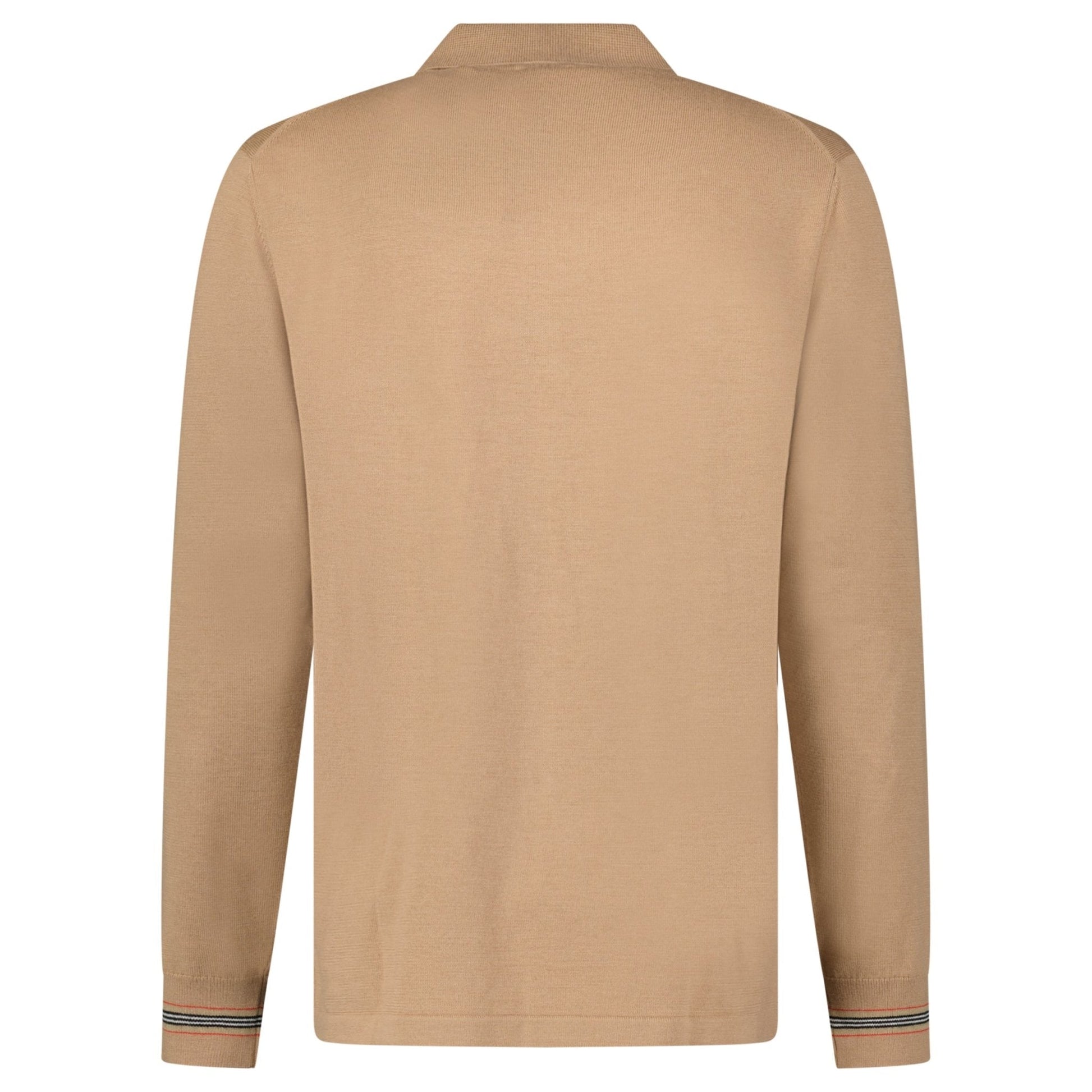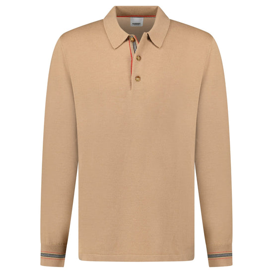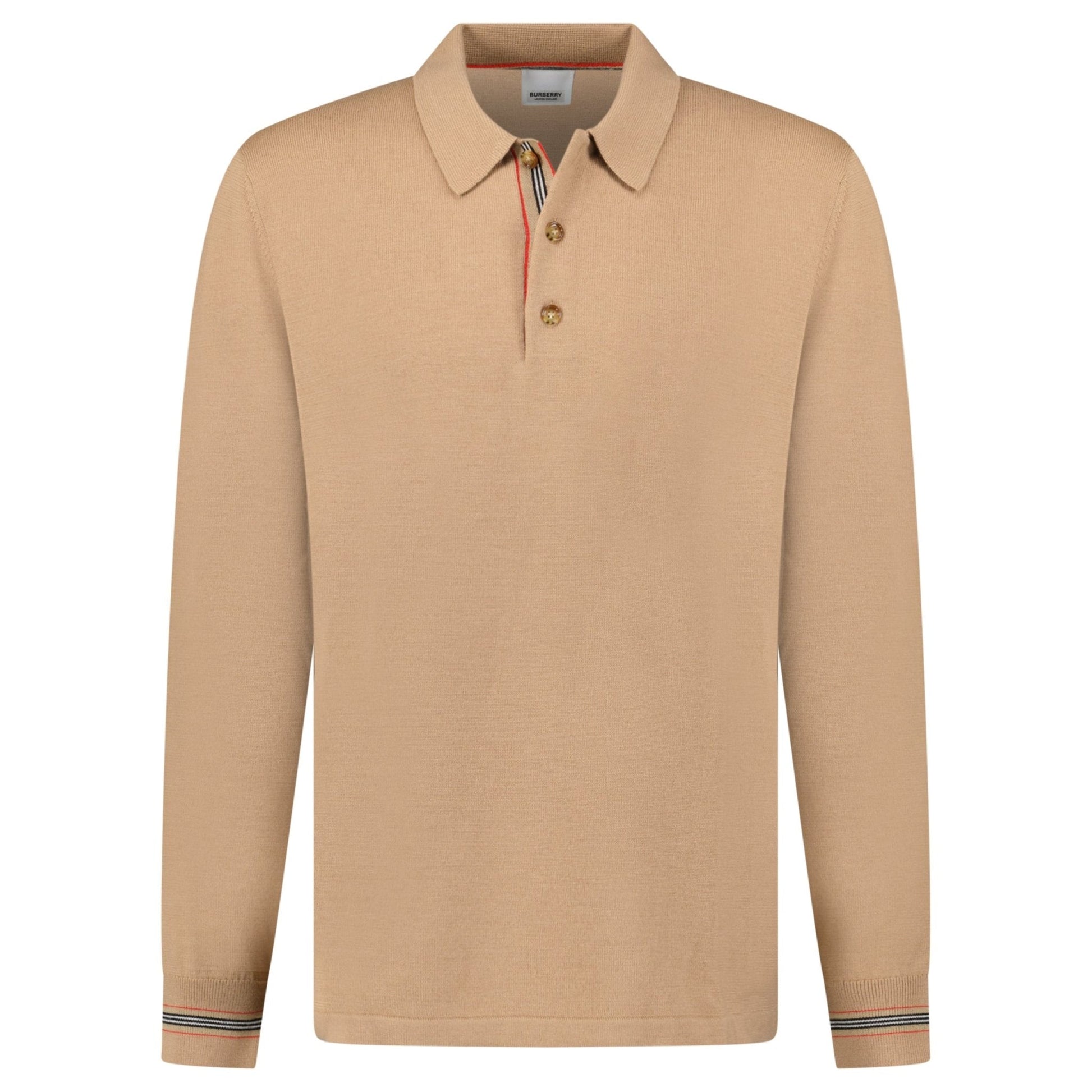 the burberry ‘pace’ signature stripe wool polo in camel delivers timeless sophistication with a modern twist. expertly crafted from soft, lightweight wool, this long-sleeve polo features a classic collar and a three-button placket adorned with the brand’s signature stripe trim for subtle distinction. ribbed cuffs with matching stripe detailing add a refined finishing touch, making it an elevated choice for both smart and casual occasions.