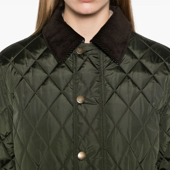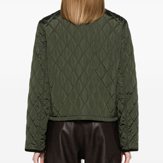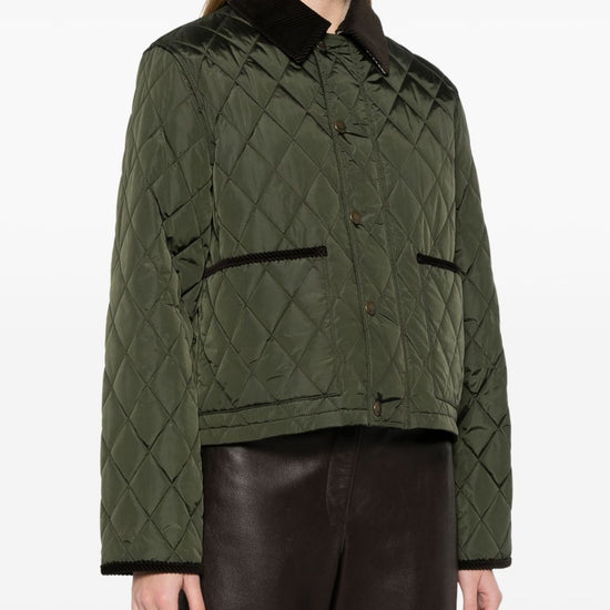 Forest green diamond quilting padded design front press-stud and zip fastening corduroy collar long sleeves two front patch pockets mini logo tag vintage check-pattern lining straight hem nylon quilted jacket size and fit - this piece fits true to size. we recommend you get your regular size. model is 1,75m / 5ft 8in wearing size s