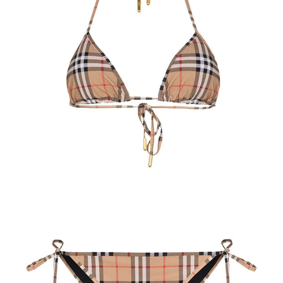 This neutral burberry vintage check bikini is covered in the signature archival check print. its bikini top features triangle cups and tie fastenings to the neck and back, whilst its bikini bottoms feature tie fastenings to the hips. if anybody's seen the ad with kate moss wearing this burberry bikini, you'll understand why we also want a white wedding veil asap. check triangle bikini set
