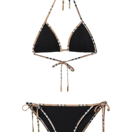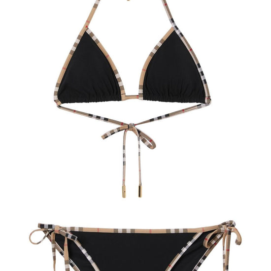 Black vintage check pattern contrasting trim side-tie bottoms halterneck tie fastening triangle cup be mindful to try on swimwear over your own garments. check triangle bikini set