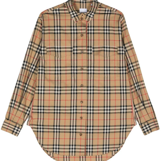 Archive beige vintage check pattern stretch-cotton button-down collar front button fastening long sleeves buttoned cuffs curved hem check motif cotton shirt size and fit - this piece fits true to size. we recommend you get your regular size. model is 1,75m / 5ft 8in wearing size 8 (uk)