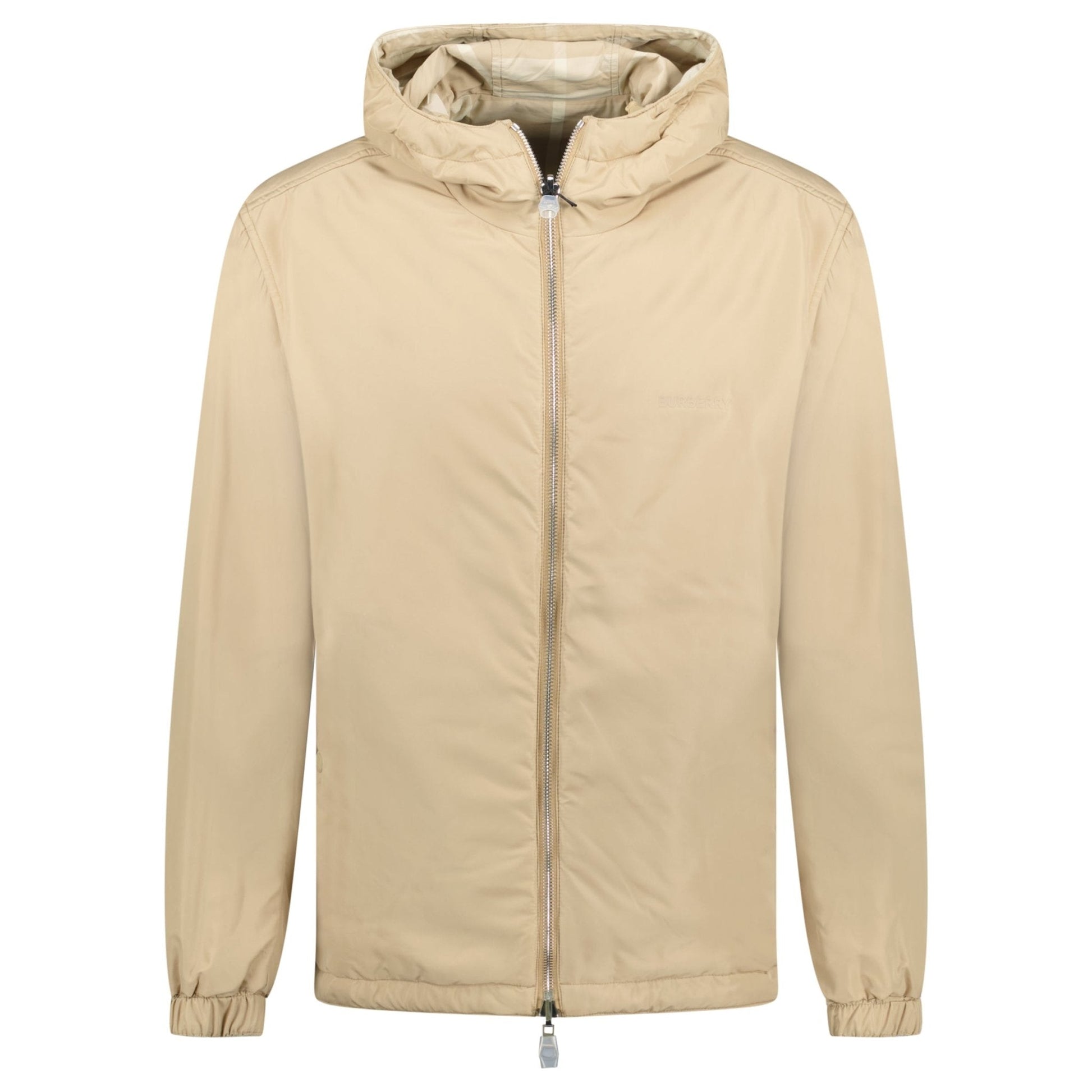 step up your outerwear game with the burberry reversible stanford check padded jacket in beige, a perfect fusion of functionality and timeless style. this jacket offers a versatile, reversible design that seamlessly switches from a sleek beige exterior to burberry's iconic interior check motif. crafted from technical fabric in a shell weave, it provides lightweight yet durable protection, ideal for transitioning through seasons. with a drawstring hood, long sleeves, and side zip pockets, this jacket combines practicality with a refined, modern aesthetic.